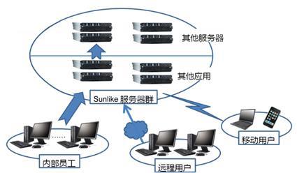 在天心软件SUNLIKE服务器上安装并发布,所有用户运行SUNLIKE服务器上的远程接入软件,并通过内部高速网络连接远程服务器,完成内部邮件、会议安排等功能模块的使用。